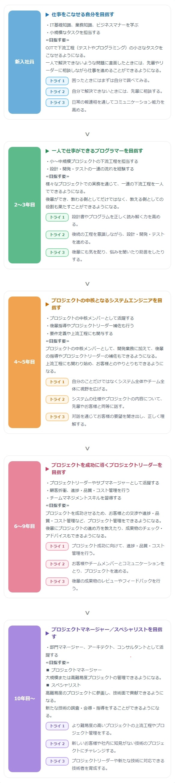 エイプルジャパンでは入社以後の各年代においても、資格・スキルを永続的に向上させていくことができる環境を整えています。まずはプログラマー・システムエンジニアとして経験を積んだ後は、技術系のスペシャリストと管理系のプロジェクトマネージャーの道が用意されています。